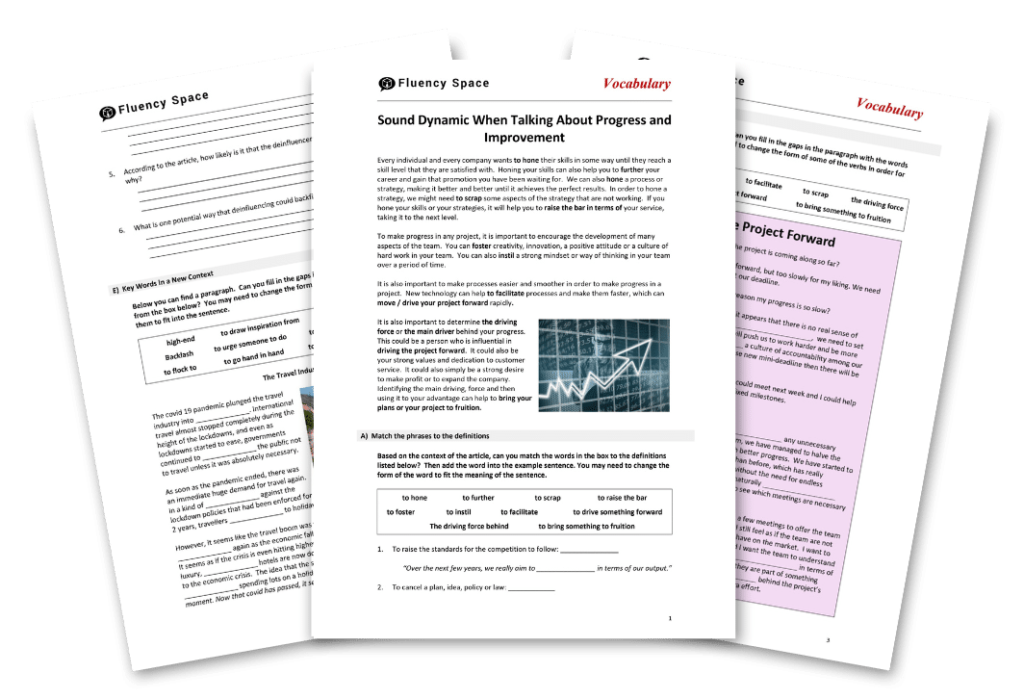 Forming a solid base of sophisticated advanced vocabulary in 9-page PDFs, complete with exercises and comprehension and guide on how to get phrasal verbs and idioms into sentences.